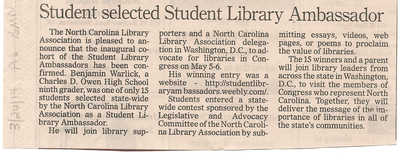 Benjamin is from Black Mountain, North Carolina and is a 9th grader at Charles D. Owen High School. His website has excellent design and content and most impressively direct input from his fellow students about the importance of libraries. View Black Mountain news article on Benjamin.
